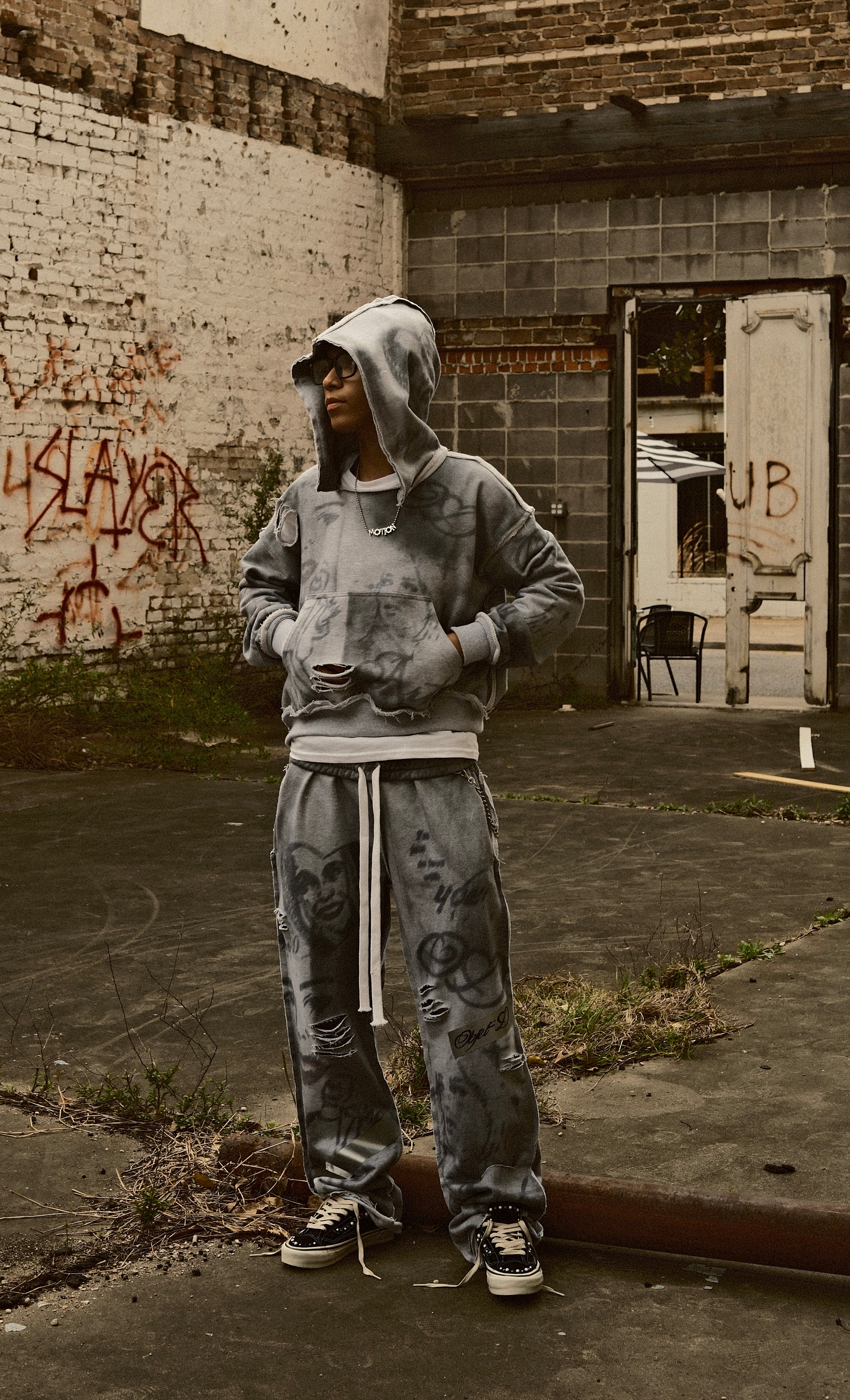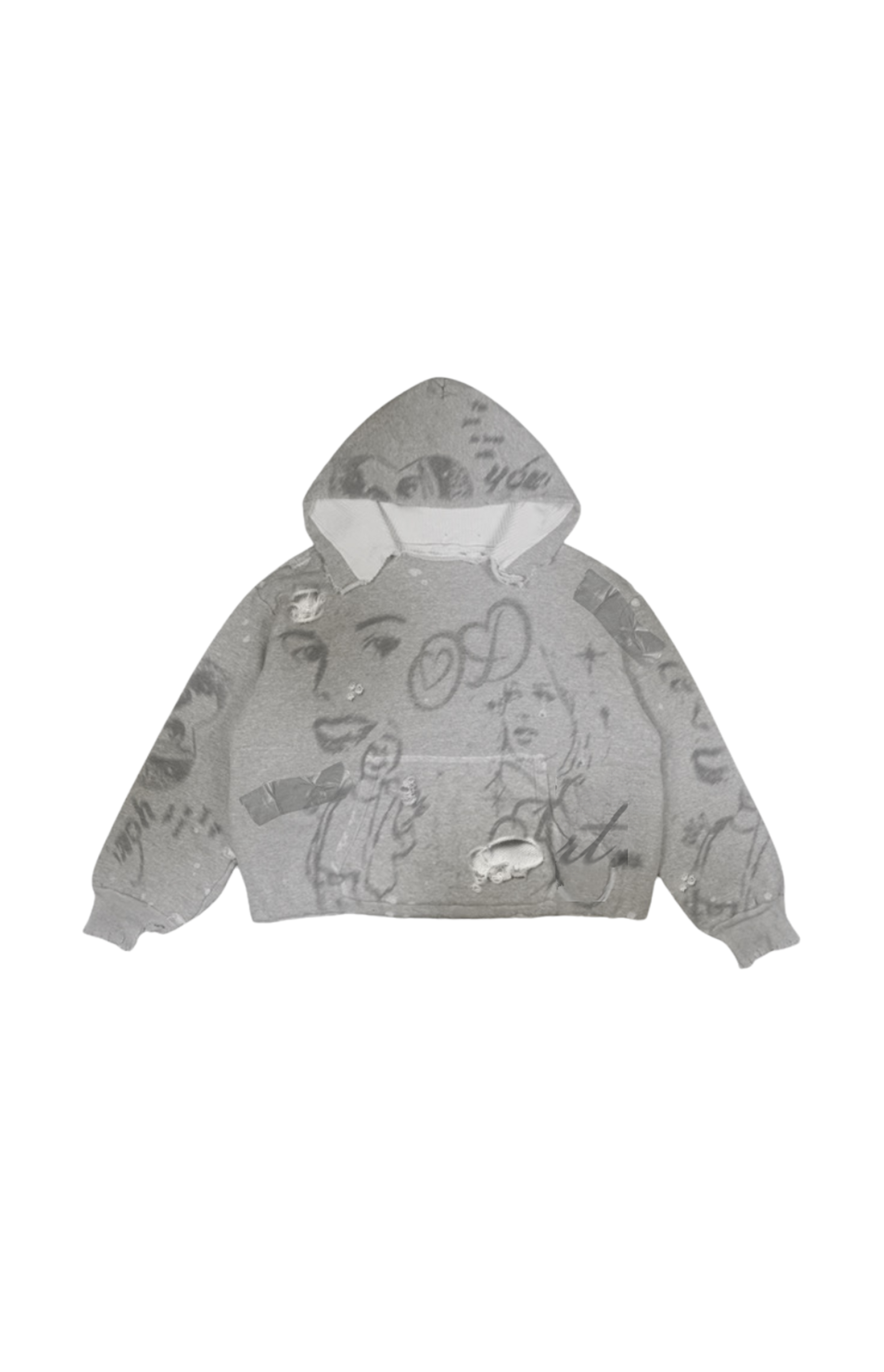 Destroyed luv hoodie featuring printed graphics, raw distressing, signature logo tape, and a washed finished.