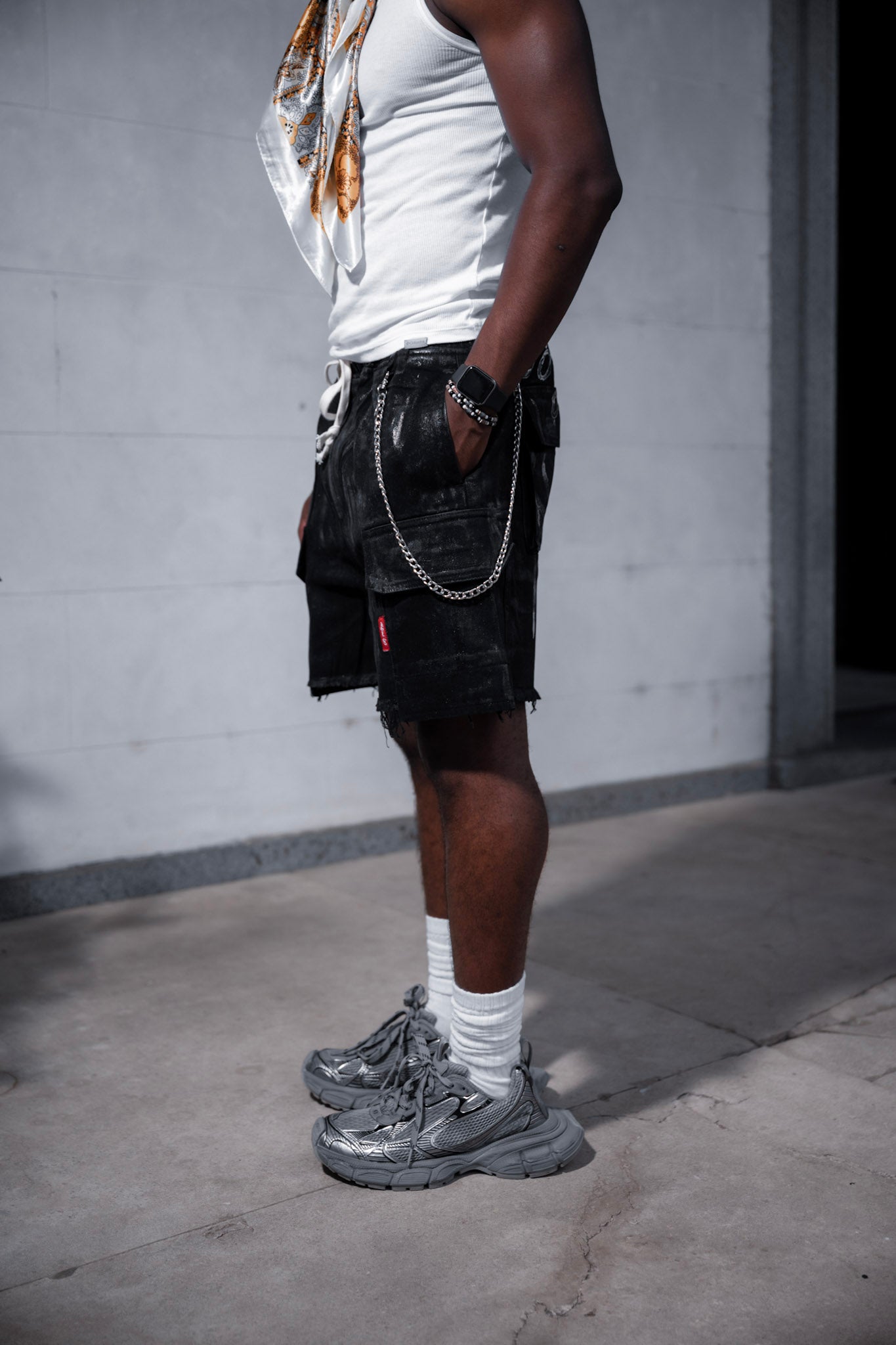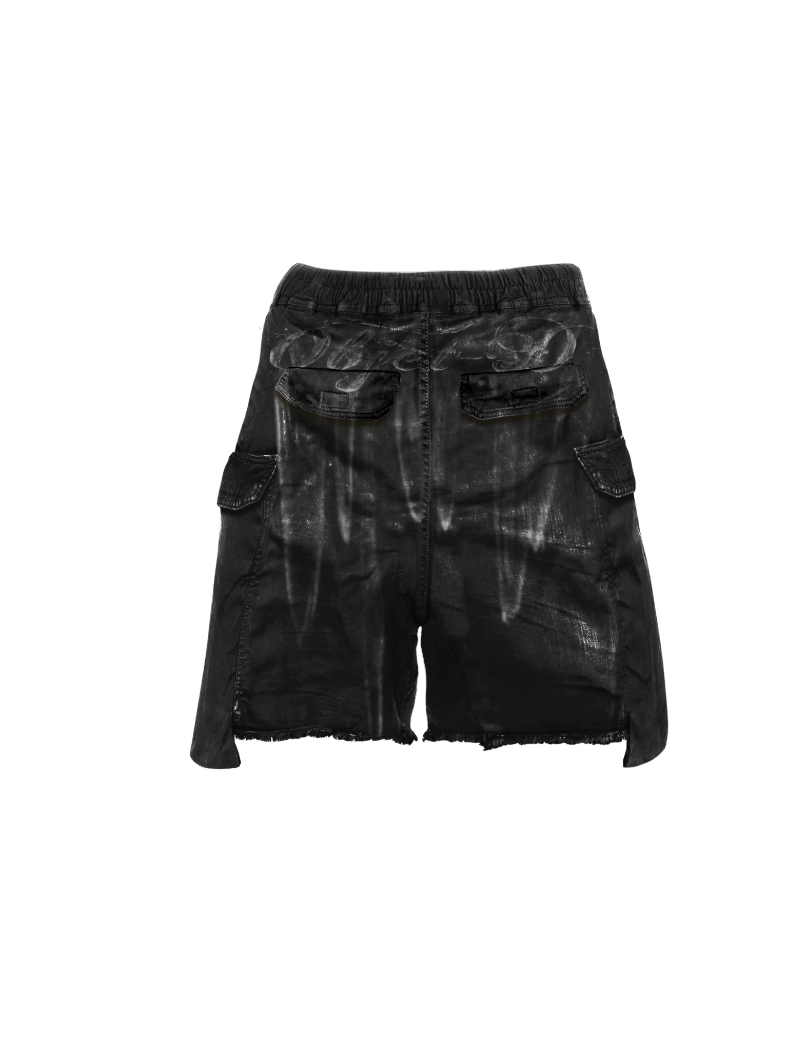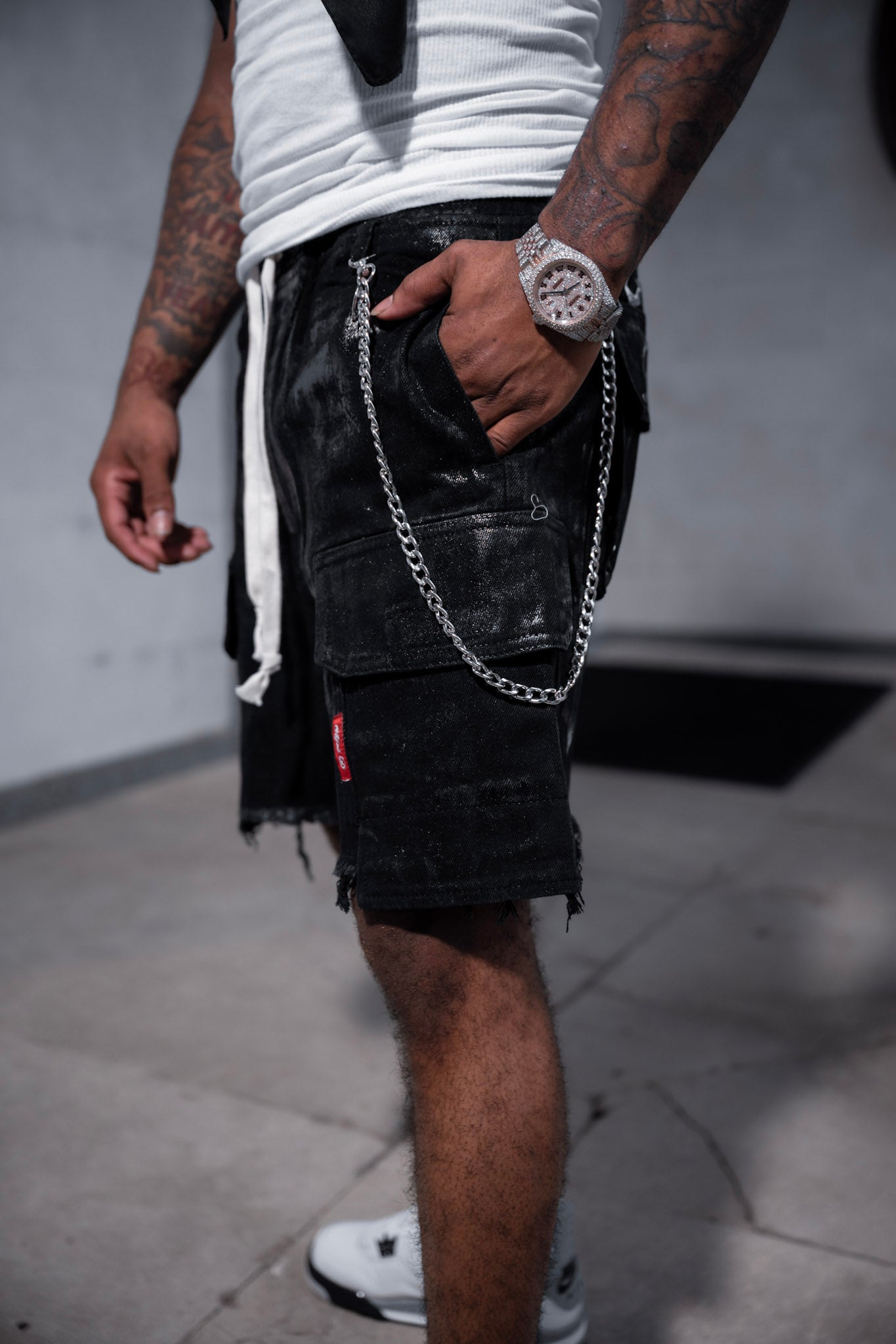 Stone-washed and waxed denim shorts featuring two side pockets, two functional cargo pockets, and two functional back pockets. Finished with frayed hems and a custom hand-painted ODA logo on the back. Includes a detachable wallet chain and a custom ODA tag. Adjustable drawstring waistband for secure fit.