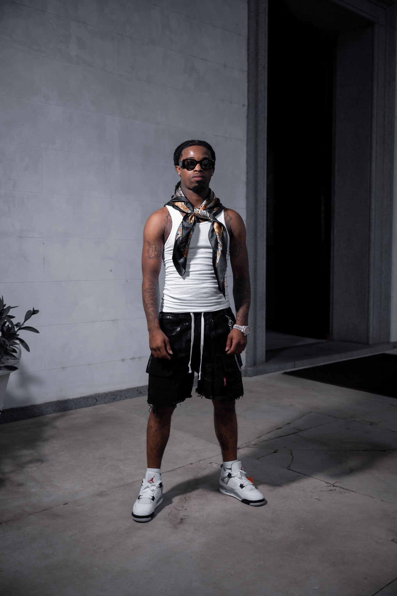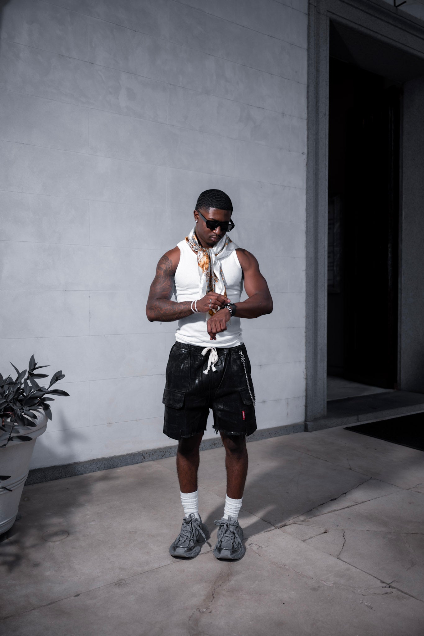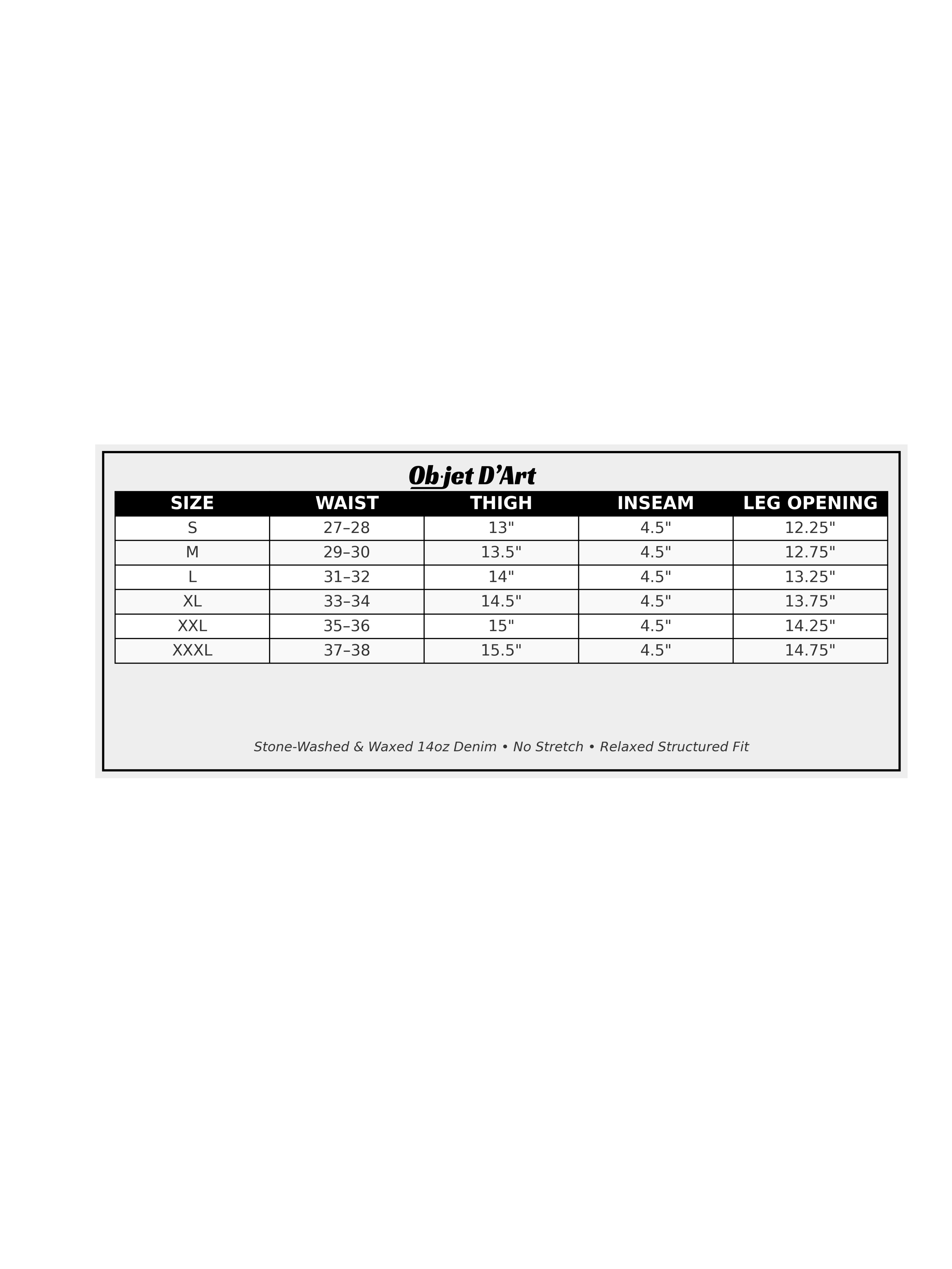 Stone-washed and waxed denim shorts featuring two side pockets, two functional cargo pockets, and two functional back pockets. Finished with frayed hems and a custom hand-painted ODA logo on the back. Includes a detachable wallet chain and a custom ODA tag. Adjustable drawstring waistband for secure fit.